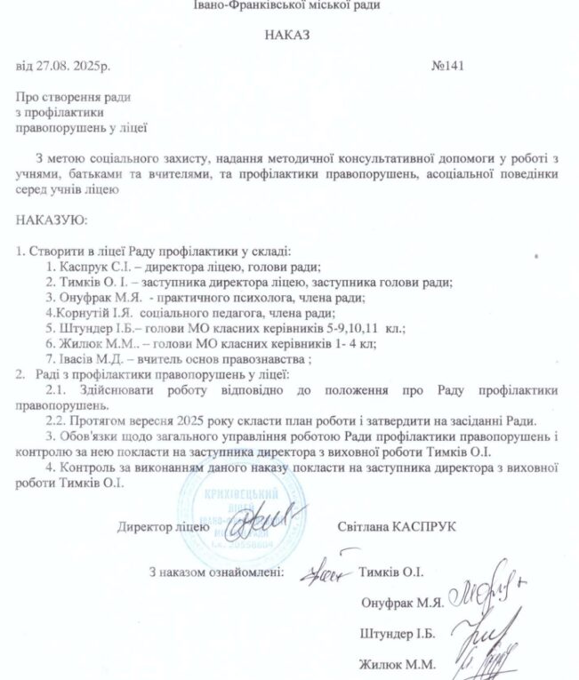 Наказ про створення ради з профілактики правопорушень у ліцеї