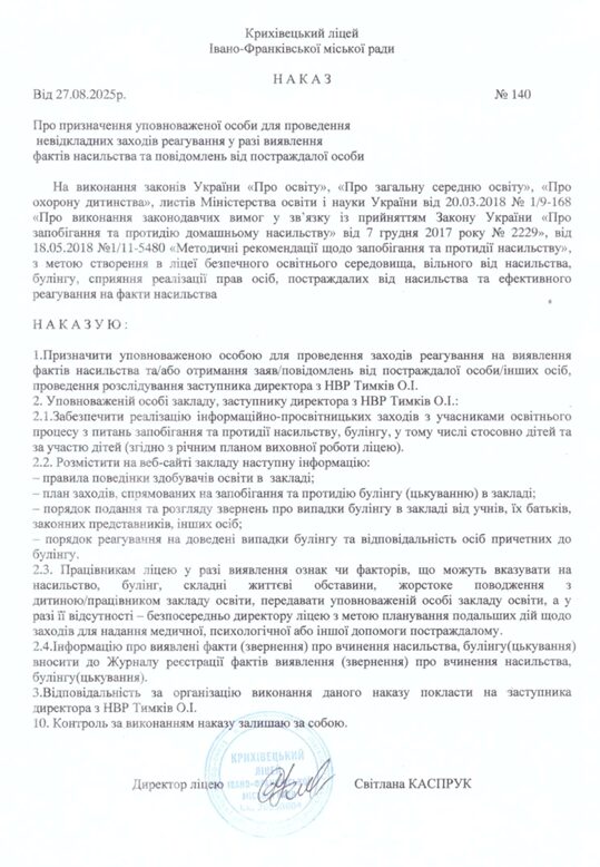 Наказ про призначення уповноваженої особи для проведення невідкладних заходів реагування у разі виявлення фактів насильства та повідомлень від постраждалої особи