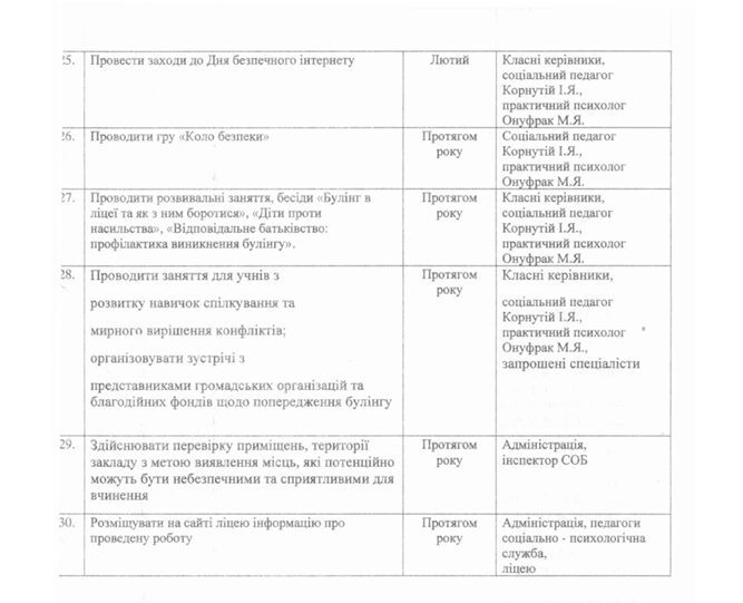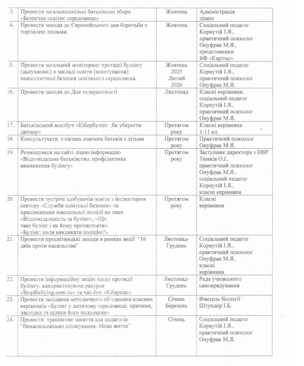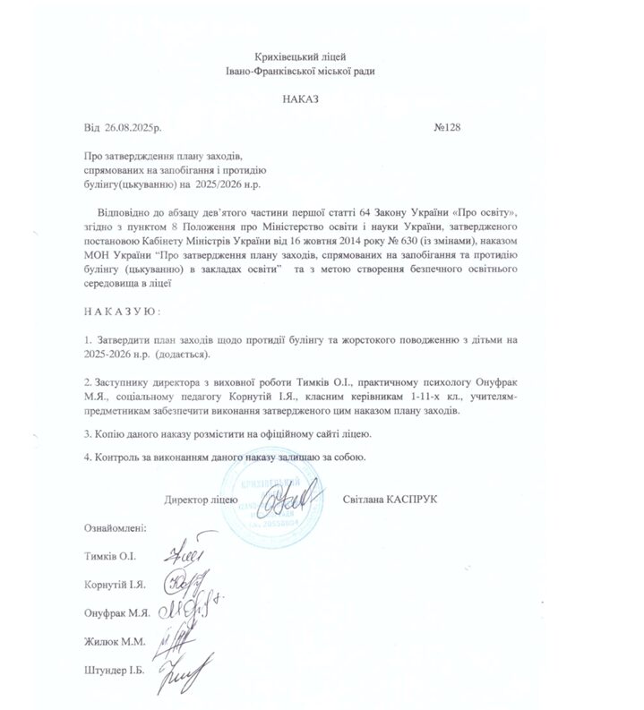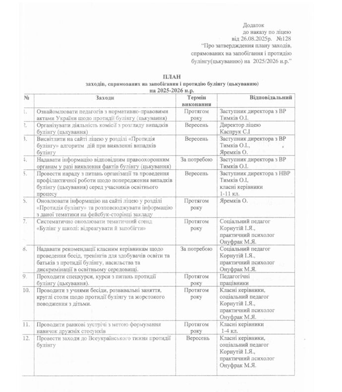 Наказ про затвердження плану заходів, спрямованих на запобігання і протидію булінгу на 2025-2026 н.р.